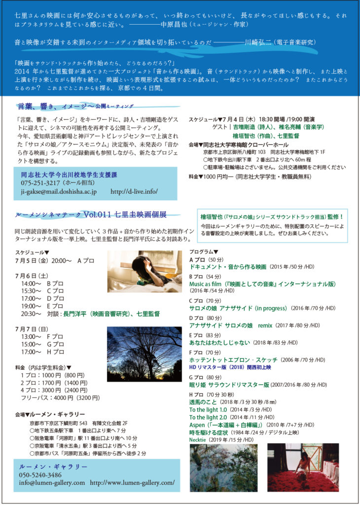 7月5日(金)〜7日(日):ルーメン・ギャラリーで上映会(七里さん企画、手伝っています! )