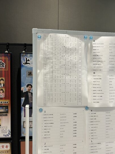 タイムスケジュールと参加する演者たちの張り紙が! この日は142組の漫才師たちが参加するようです。1日でこんなに漫才を見ることはないのでワクワクしました。