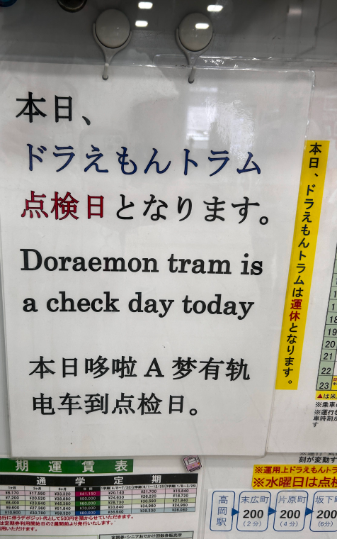 私も高岡市にドラえもん柄のトラム(路面電車のようなもの)があると知ったので、駅についたところ、その日はドラえもん柄のトラムが点検日で運行していませんでした。